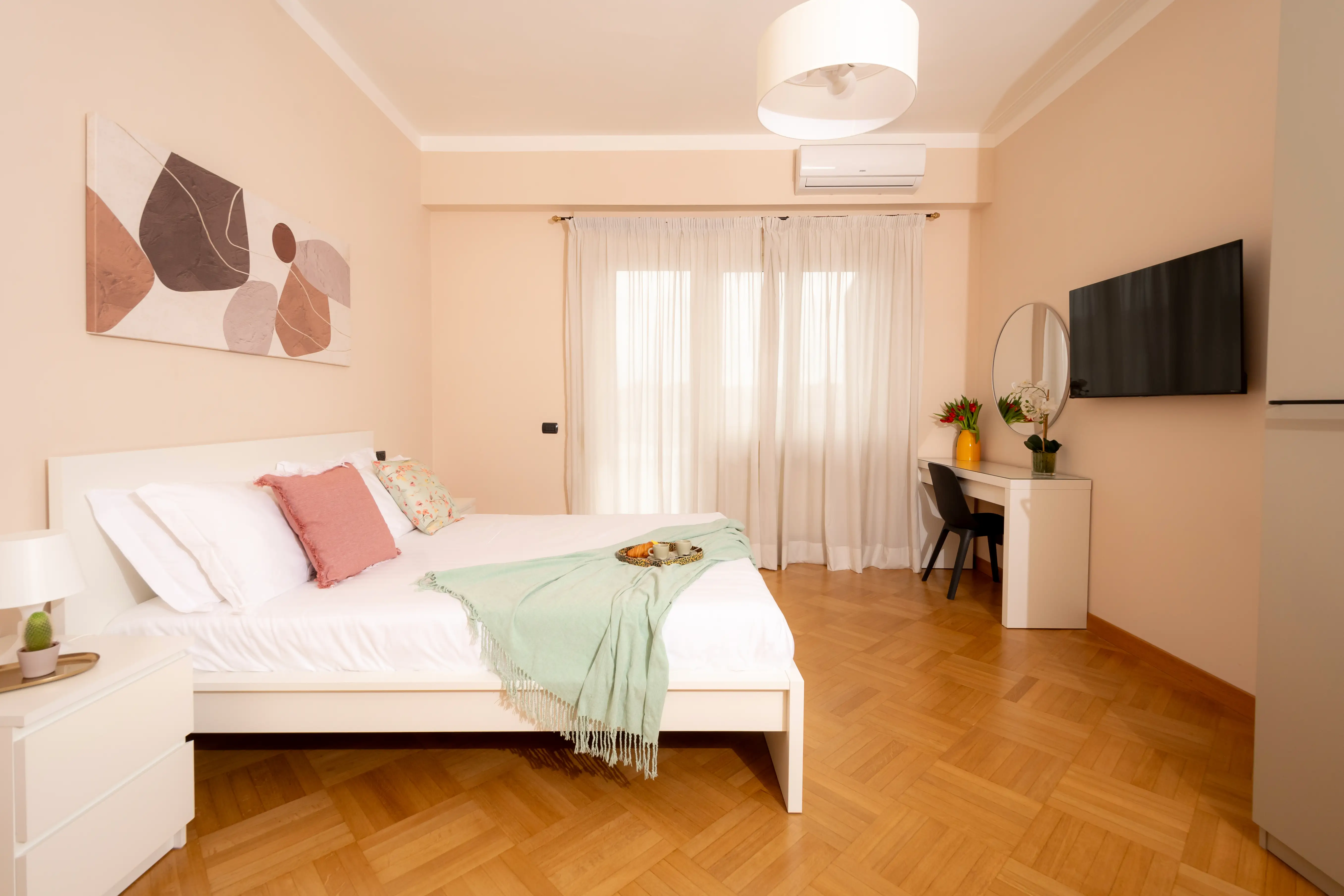 A soli 700 metri dai Musei Vaticani, questo elegante appartamento di 90 m² può ospitare fino a 6 persone e vi regalerà un’esperienza unica. L’ampio terrazzo, con una vista mozzafiato sulla Cupola di San Pietro, sarà il vostro salotto romano all’aperto. Situato in una zona tranquilla e sicura, con la fermata metro a pochi passi da casa, raggiungerete facilmente ogni angolo di Roma. L’appartamento è ideale per famiglie, coppie, amici e viaggiatori in cerca di comfort, spazio e autenticità.